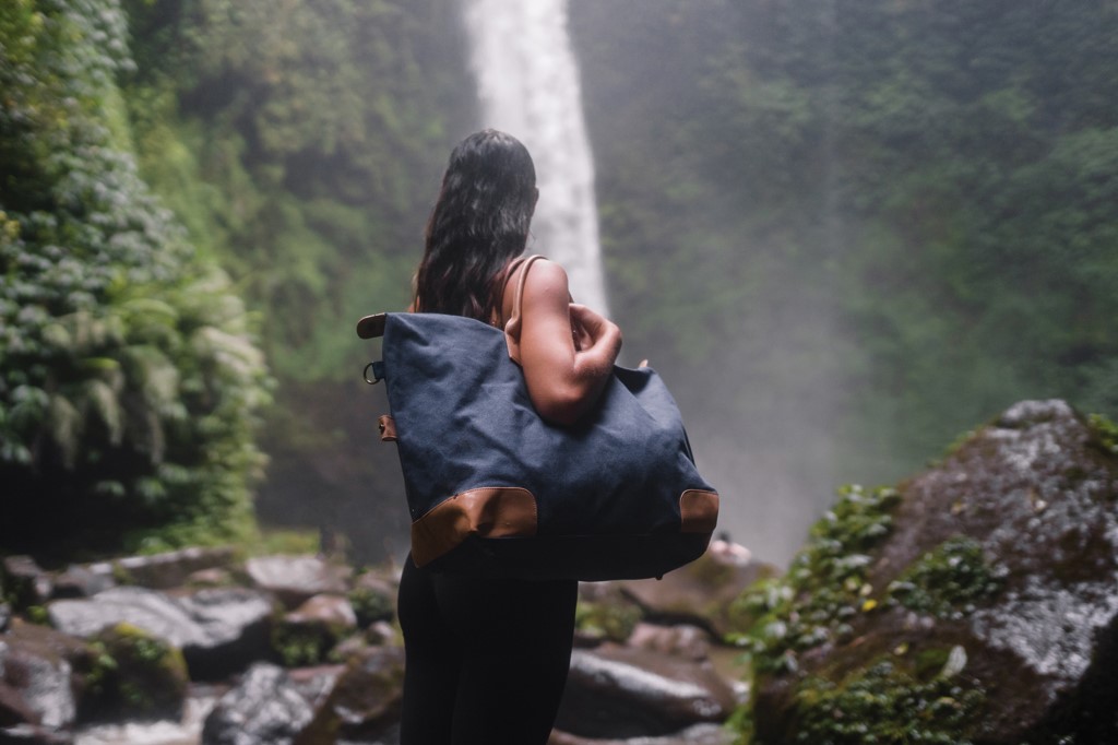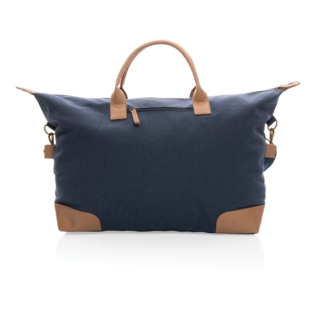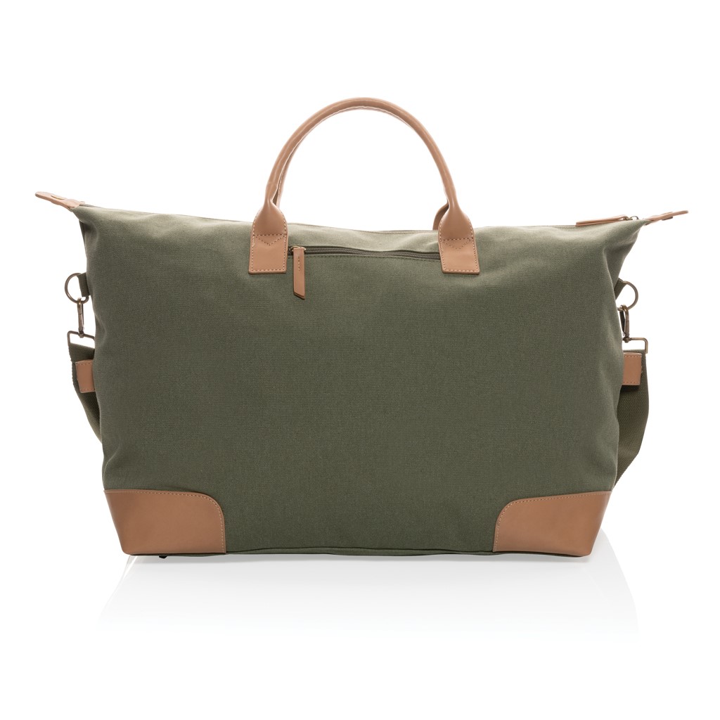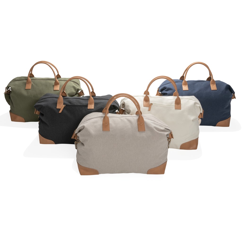 Planirajte svoj savršeni bijeg s ovim velikim 16oz. vikend torba od recikliranog platna. Torba ima jedan veliki prostrani pretinac s prednjim džepom i PU ručkama. Dno ima četiri mjedena klina kako bi vaša torba bila čista kada je stavite na pod.