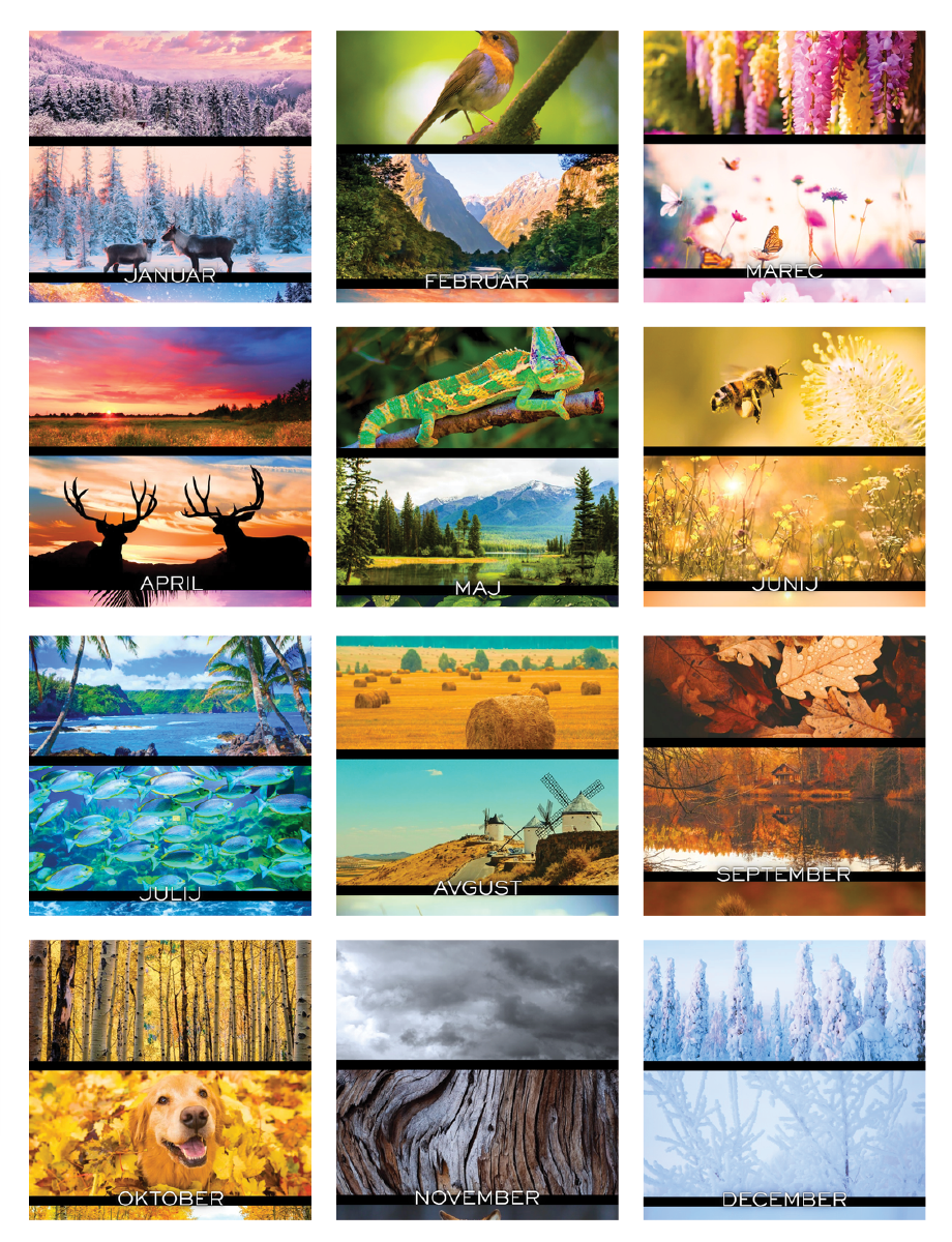 33 x 54 cm, 13-listni zidni kalendar s fotografijama vrhunske kvalitete... Obilježeni slovenski praznici.
