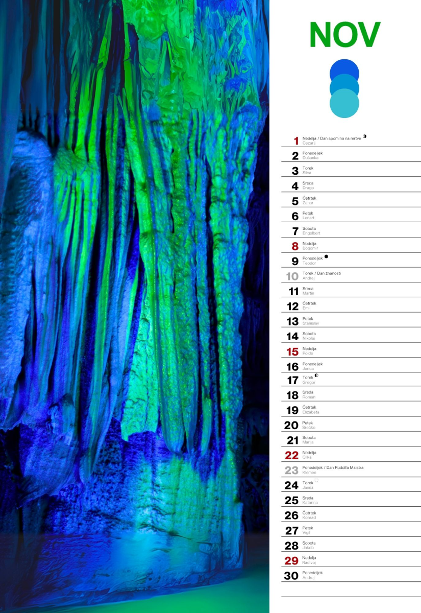 33 x 54 cm, 13-listni zidni kalendar s prekrasnim fotografijama prirode. Obilježeni slovenski praznici.