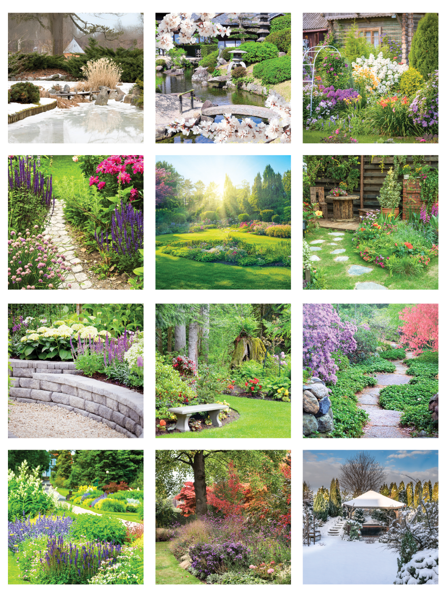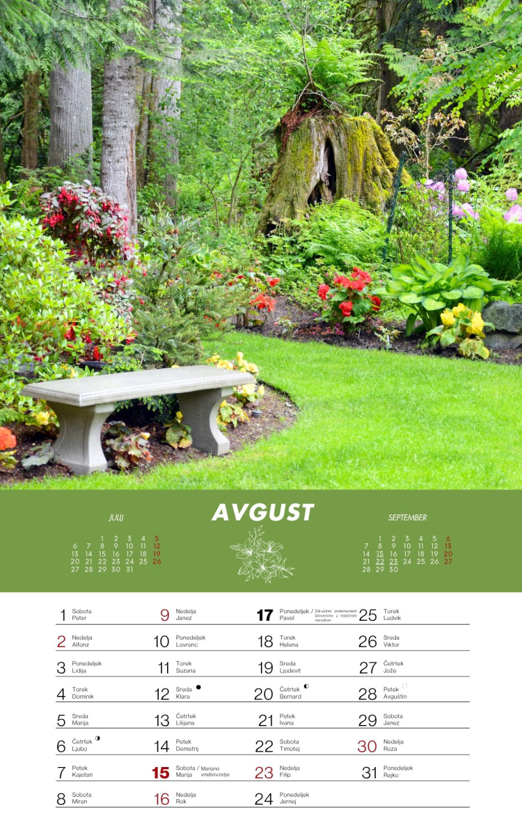 33 x 54 cm, 13-listni zidni kalendar s vrtnim fotografijama. Obilježeni slovenski praznici.