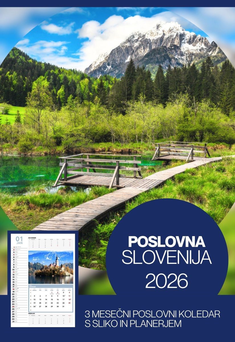 33 x 54 cm, 13 listova, zidni kalendar s motivima Slovenije. Označeni mjeseci, slovenski praznici i imena.