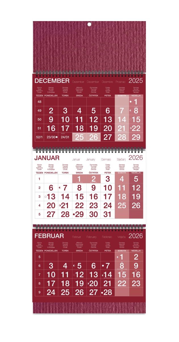 25 x 67 cm, 12 listova (3x), spiralni uvez, četiri jezika (Slo, Eng, Njemački, Ita), označeni slovenski i strani praznici, mjeseci, s datumom.