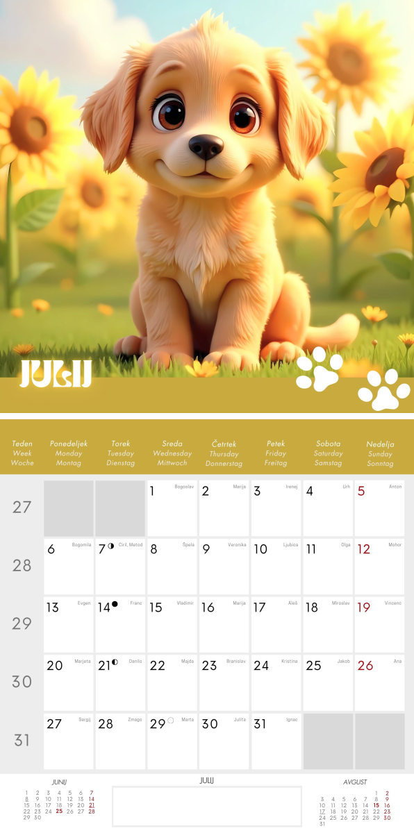 30 x 66 cm (odprt), 13 listni stenski koledar s fotografijami živali. Označene lune, slovenski in tuji (H, D, A, I, CRO) prazniki in imena.