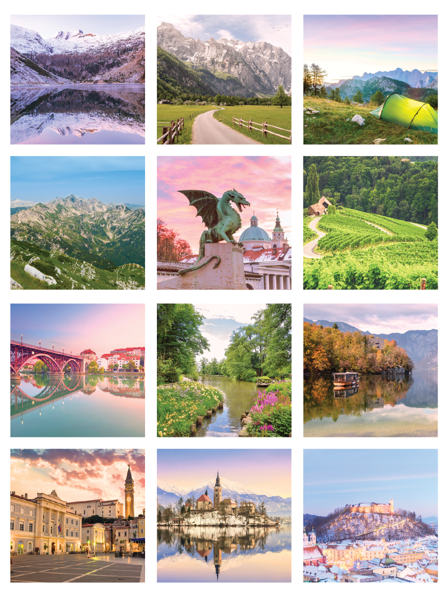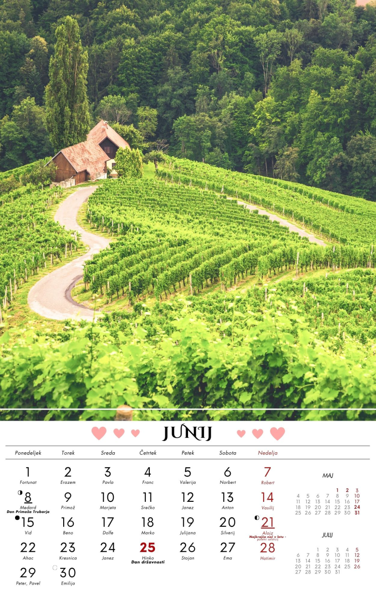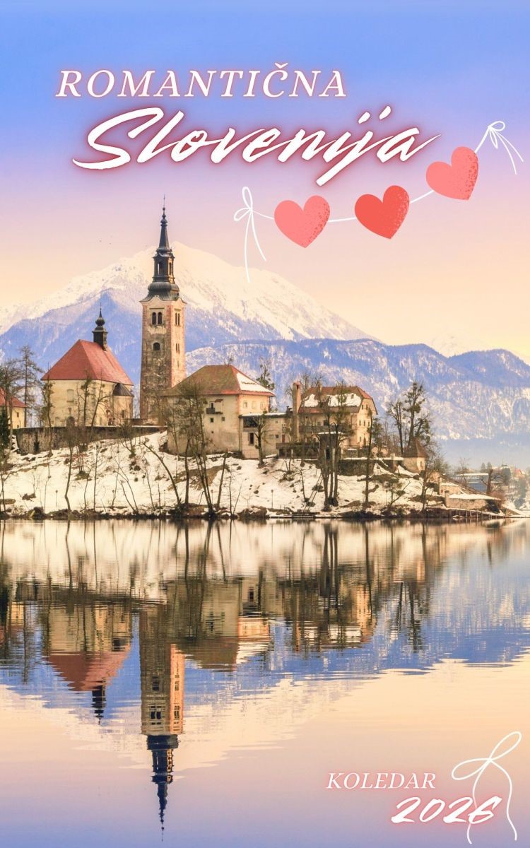 33 x 54 cm, 13-listni zidni kalendar s romantičnim fotografijama Slovenije. Označeni mjeseci, slovenski praznici i imena.
