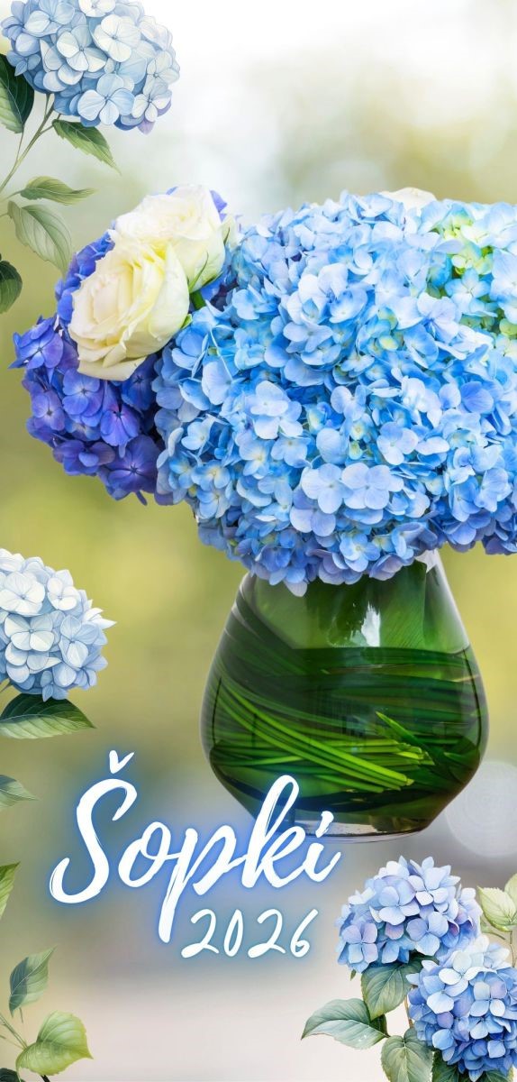 22,5 x 54 cm, zidni kalendar od 13 stranica sa fotografijama buketa. Obilježeni mjeseci, slovenski praznici i imena.