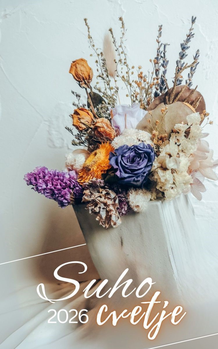 33cm x 54cm, 13 listova, zidni kalendar s fotografijama aranžmana od suhog cvijeća. Označeni slovenski praznici.