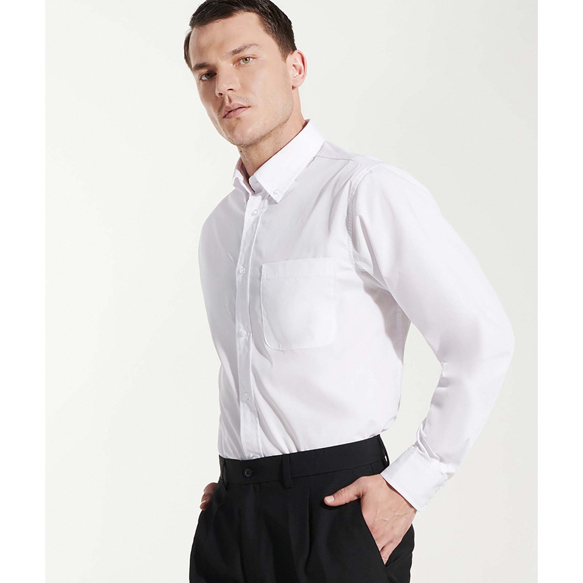 Materijal popelin. Ovratnik s jednim gumbom. Džep na strani srca. Pas s 7 gumba iste boje. Ukrivljen rub. Jednostavno održavanje.