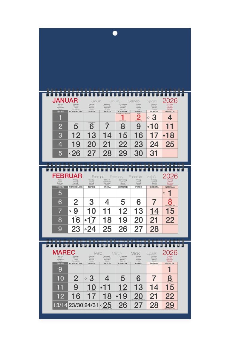 30cm x 63cm, 12 listova (x3), spirala, 4-jezični (slo, eng, njem, ita), označeni slovenski i strani praznici, mjeseci, s označivačem datuma.