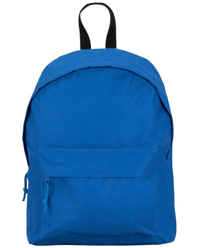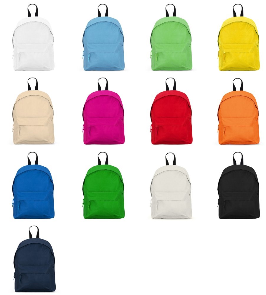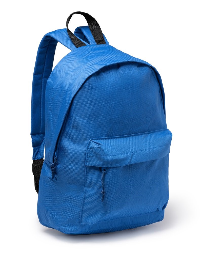 Obični ruksak od otporne tkanine. 1. Dupla ručka za rame u kontrastu od ručke za ruke. 2. Dva džepa, jedan glavni džep i jedan na prednjoj strani sa zatvaračem, poklopac i vezice za povlačenje u istoj nijansi.