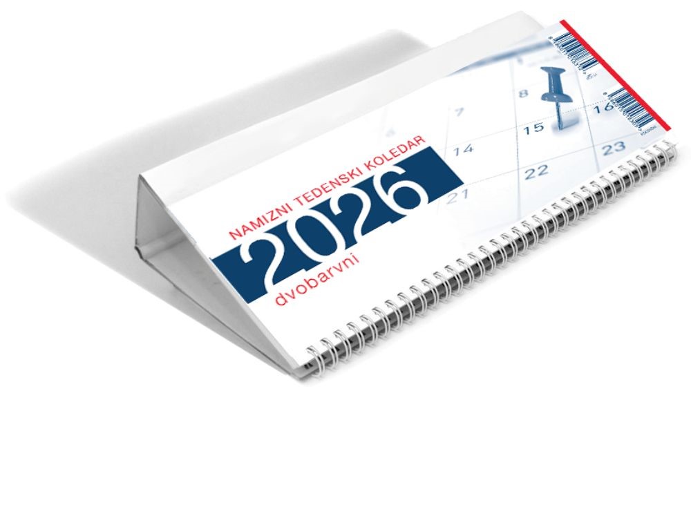 30 x 15 x 5 cm, stolni pejzažni kalendar, 53 lista. Obilježeni mjeseci, slovenski i međunarodni praznici i imena.