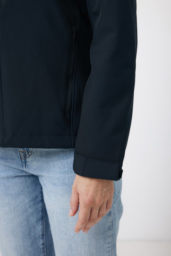 - Ženska softshell jakna izrađena od recikliranog poliestera s 300 g/m² 3-slojne tkanine, od reciklirane TPU membrane i mekanog mikroflisa iznutra.