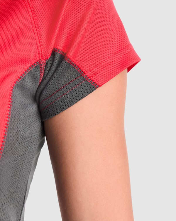 Tehnička ženska T majica. Kombinirana su 2 poliesterska materijala. Kratki rukavi Raglan. Bočni umeci i unutarnji dio rukava izrađeni su od mikroperforiranog materijala. Okrugli ovratnik s ojačanim šavovima. Udobna majica koja se prilijega uz tijelo.
